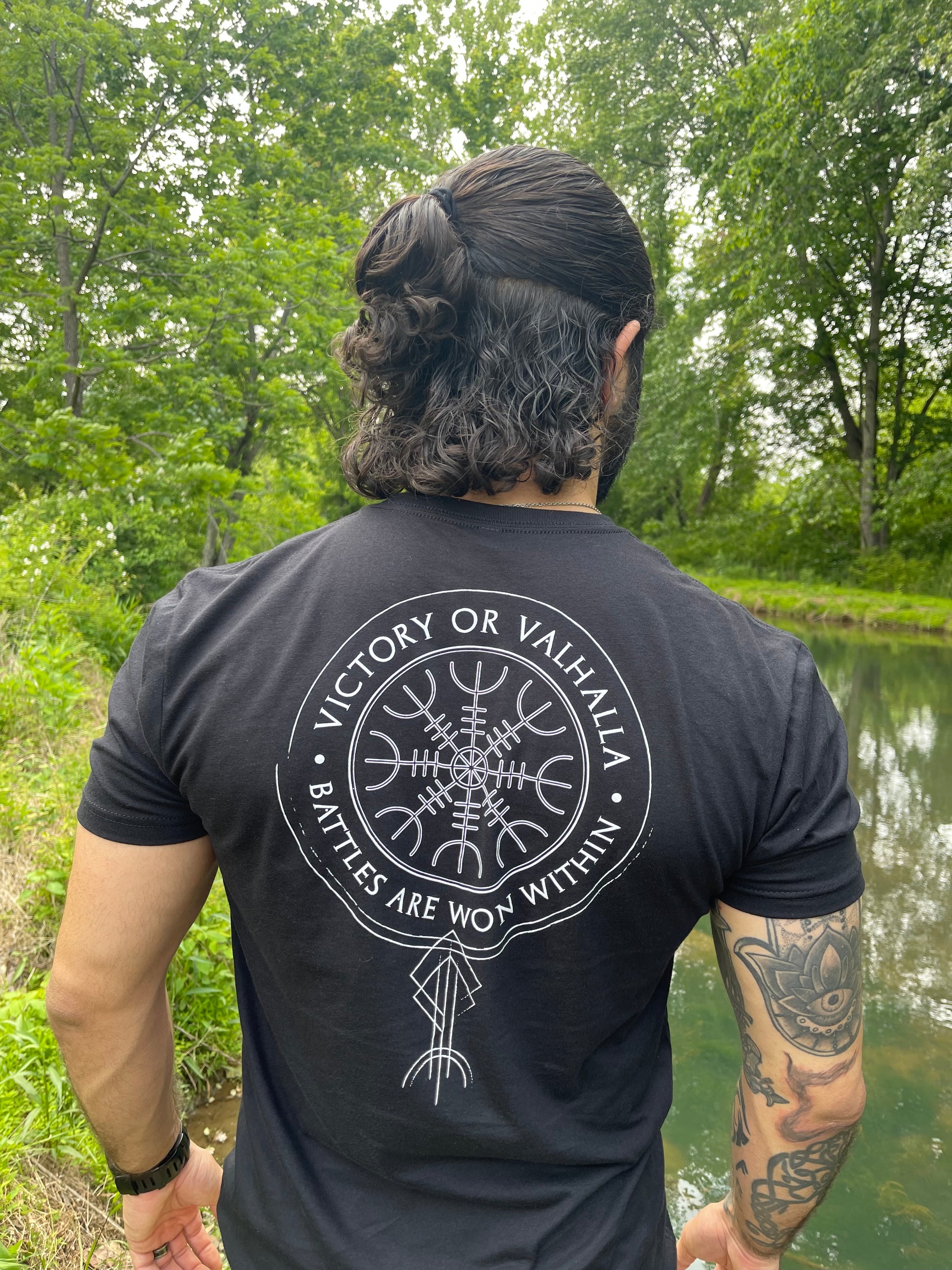 Introducing our captivating t-shirt adorned with the empowering slogan "Victory or Valhalla, battles are won within," beautifully displayed on the back. This extraordinary t-shirt merges the essence of ancient Norse symbols—the Valknut and the Helm of Awe—into a powerful design that inspires you to conquer life's challenges.